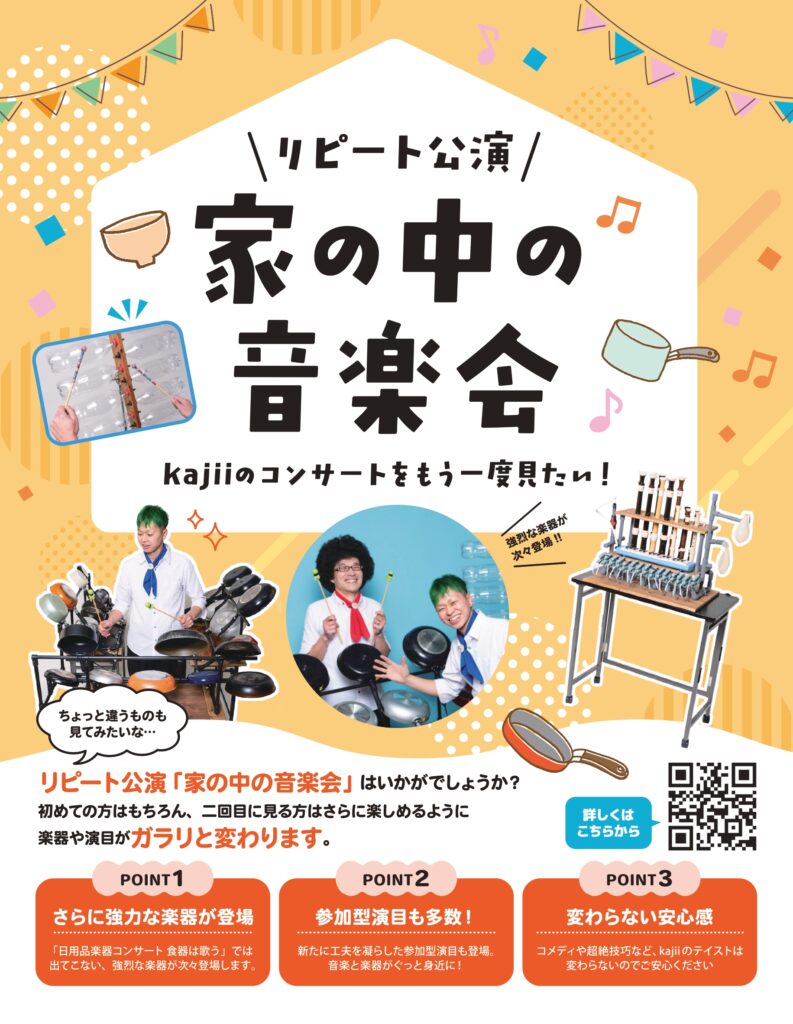 楽器や演目こそ変わりますが、メンバーや内容の安心感、演奏時間や料金は「日用品楽器コンサート 食器は歌う」と変わりません。