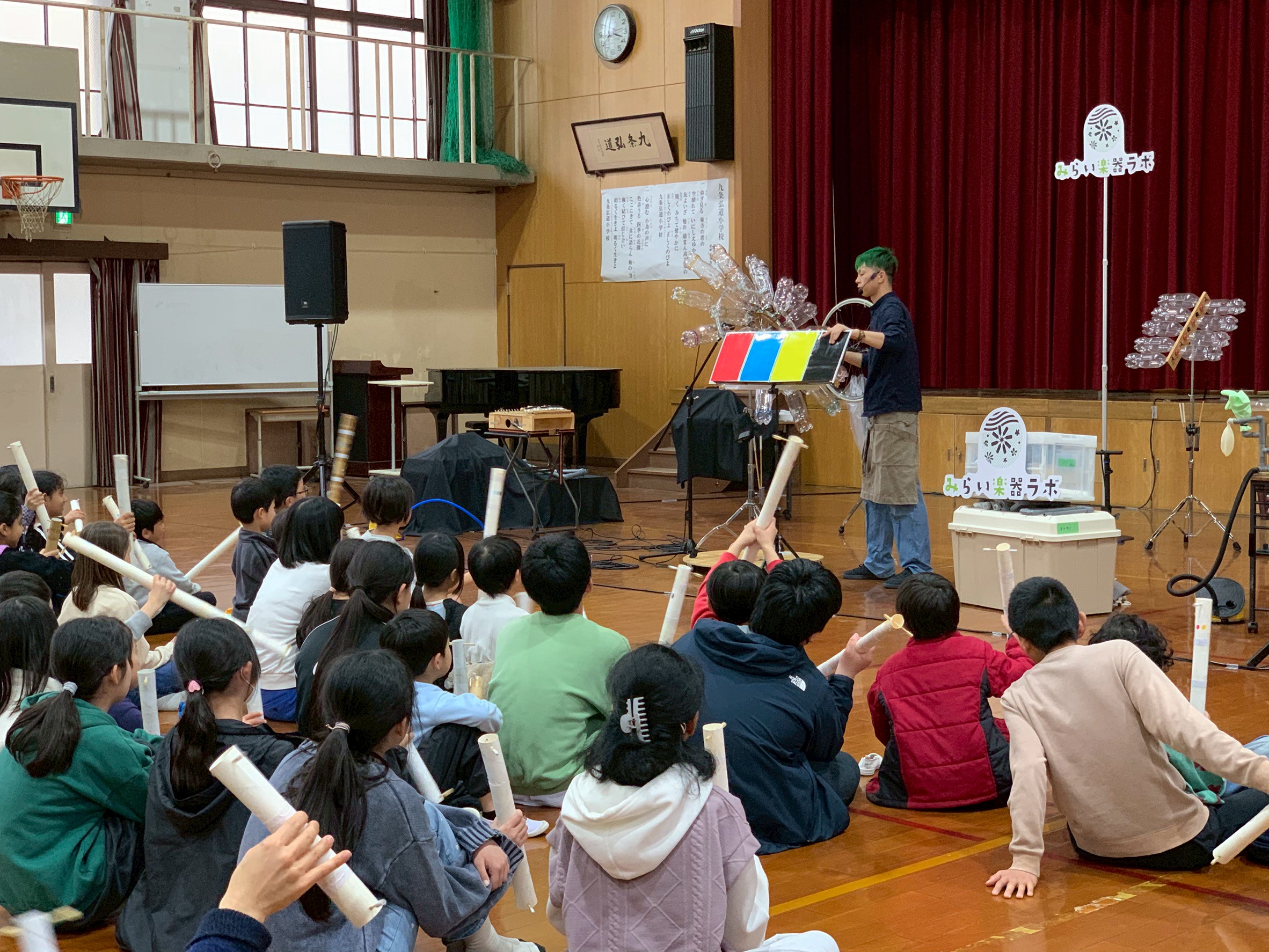 「みらい楽器ラボ」は、廃品から生まれたふしぎな楽器が次々と登場するステージショーです。